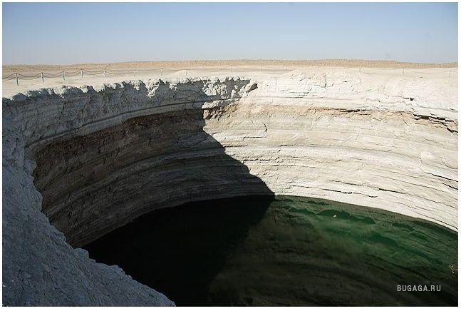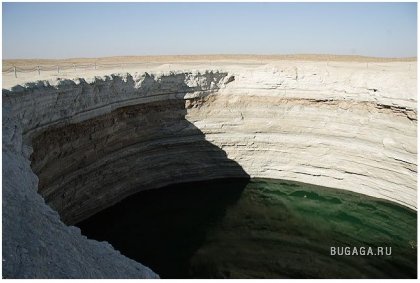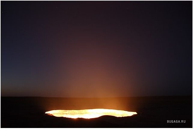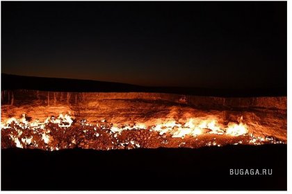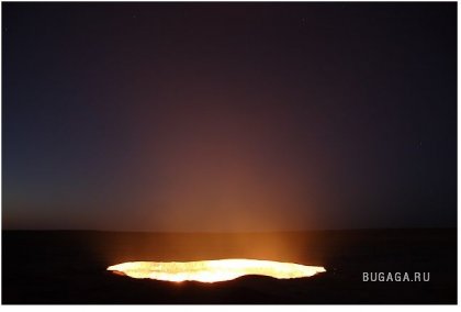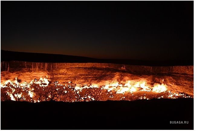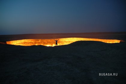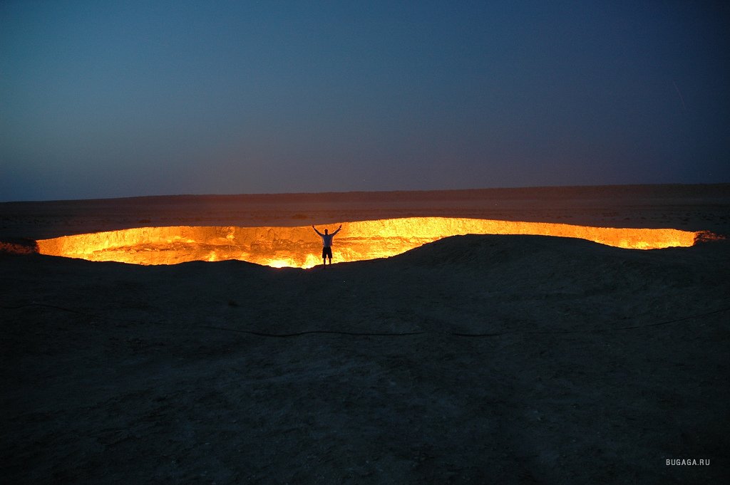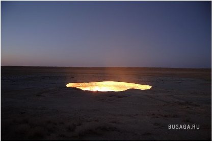 Одну из дверей в Ад можно найти — в Туркменистане, в местечке с названием Дарваза (Darvaza) Путь сюда лежит через Каракумы, что в переводе означает «черные пески», Дарваза — «дверь». Итак, «дверь в пустыню посреди черных песков» — внушает. Кроме чабанов и верблюдов на вольном выпасе, здесь никого нет на десятки километров вокруг. До ближайшего кишлака Ербент 90 километров. Здесь находятся самые настоящие двери в преисподнюю. Из гигантских котлов вырывается горящий газ. Ничто, попавшее вовнутрь уже не может выбраться. Любое живое существо обречено. Попав в загробный мир через эти «двери», никто не может выбраться. Гудящий и пышущий горячим воздухом кратер диаметром 60 и глубиной 20 метров. Газ идет из пор земли, разделяясь на сотни горящих разновеликих факелов. В некоторых факелах языки пламени достигают 10–15 метров в высоту. Происхождение этого завораживающего зрелища весьма прозаично: в 1971 году здесь бурили разведочную скважину на газ и наткнулись на подземную каверну. Буровая вышка со всем оборудованием и транспортом провалилась. Люди, слава богу, не пострадали. Из техногенного кратера пошел природный газ. Чтобы не травились люди и скот, газ подожгли. С тех пор, вот уже 35 лет, горят негасимые факелы. Сколько с тех пор сгорело миллиардов кубометров ценнейшего природного сырья, не знает никто. Самое интересное, что неподалеку, находятся ещё два подобных провала аналогичного происхождения. Эти кратеры не горят, напор газа здесь гораздо слабее. На дне одного из кратеров — пузырящаяся жидкая грязь светло-серого цвета, на дне другого — крутой рассол изумительного бирюзового оттенка. Специалисты говорят, что с помощью наклонно-направленного бурения из более плотных участков две из трех коварных залежей могут эксплуатироваться (судя по всему, запасы здесь промышленные — в частности, газ залегает довольно близко к поверхности земли). Кстати, недалеко от огненного кратера есть несколько законсервированных скважин с остатками устьевой арматуры, и снова ввести их в строй нетрудно. А вот на участке с «бирюзовым» озером, где в пласте допущен водогазовый контакт, добыча, по-видимому, уже невозможна. |